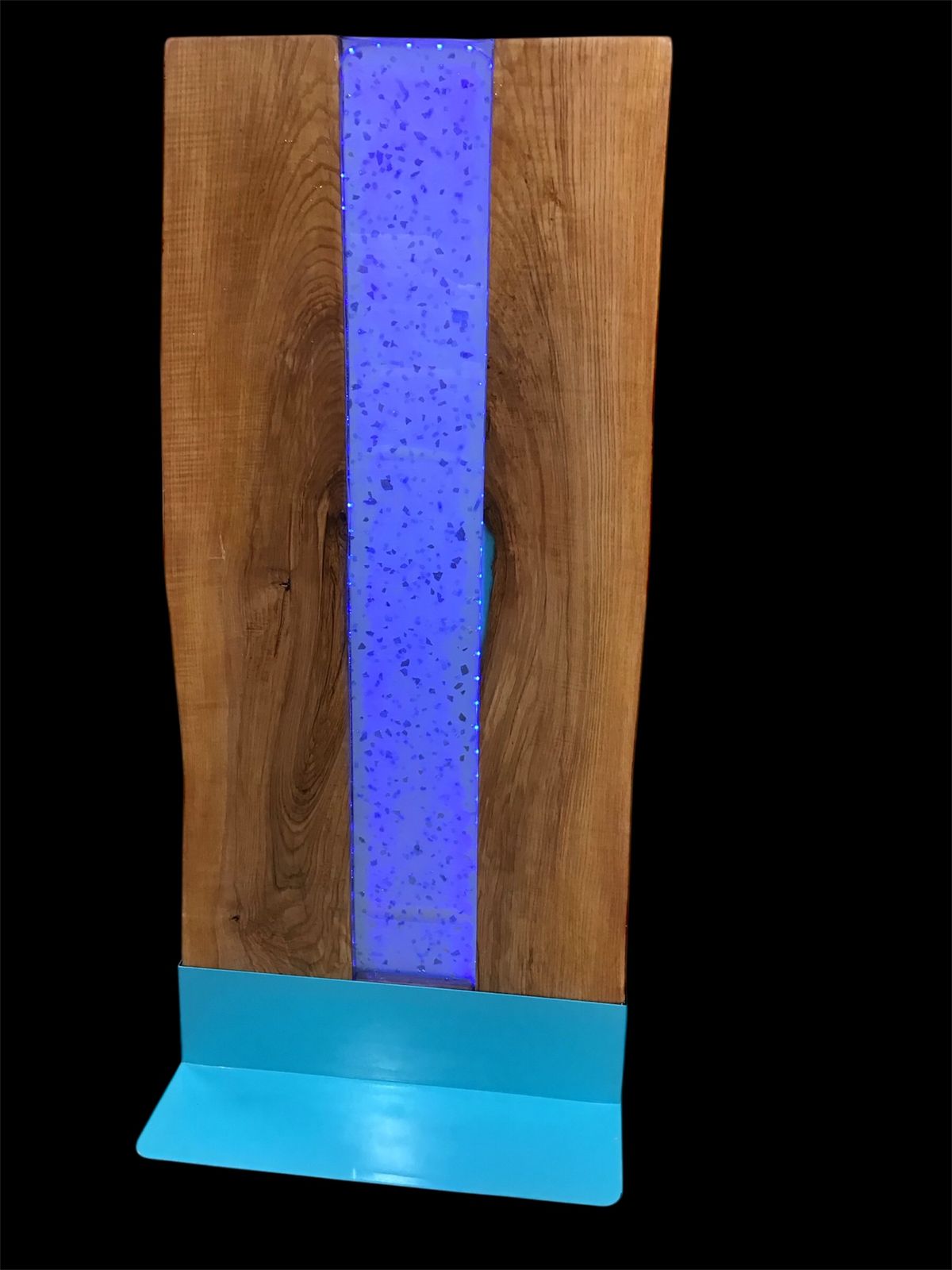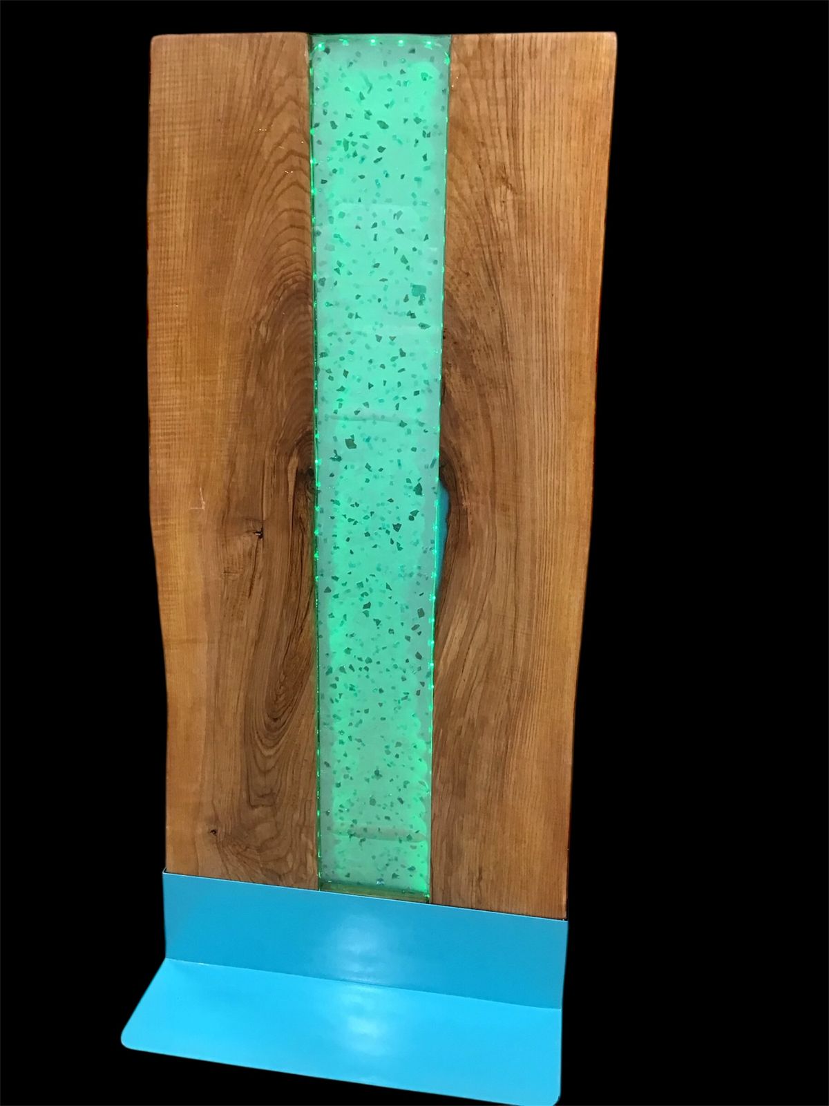 Making something other than a Dining Table or Bench, I used 3 gallons of Upstart Deep Pour tinted with a transparent turquoise to create this lighted “sculpture”! Standing 4’6” tall with two live edge Ash pieces (one cut in half) and a 6” river down the center. Within the epoxy, I waited for the perfect time to add turquoise pieces of mirrored broken glass to reflect off the sun during the day……….but at night one can light it up with an array of colors from the LED rope light hidden in a channel in the live edge. The final step was to add a 1/8” pour of the Upstart 1:1 Epoxy for the final top coat.
